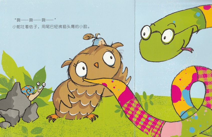 小蛇用尾巴轻拂猫头鹰的小脸。