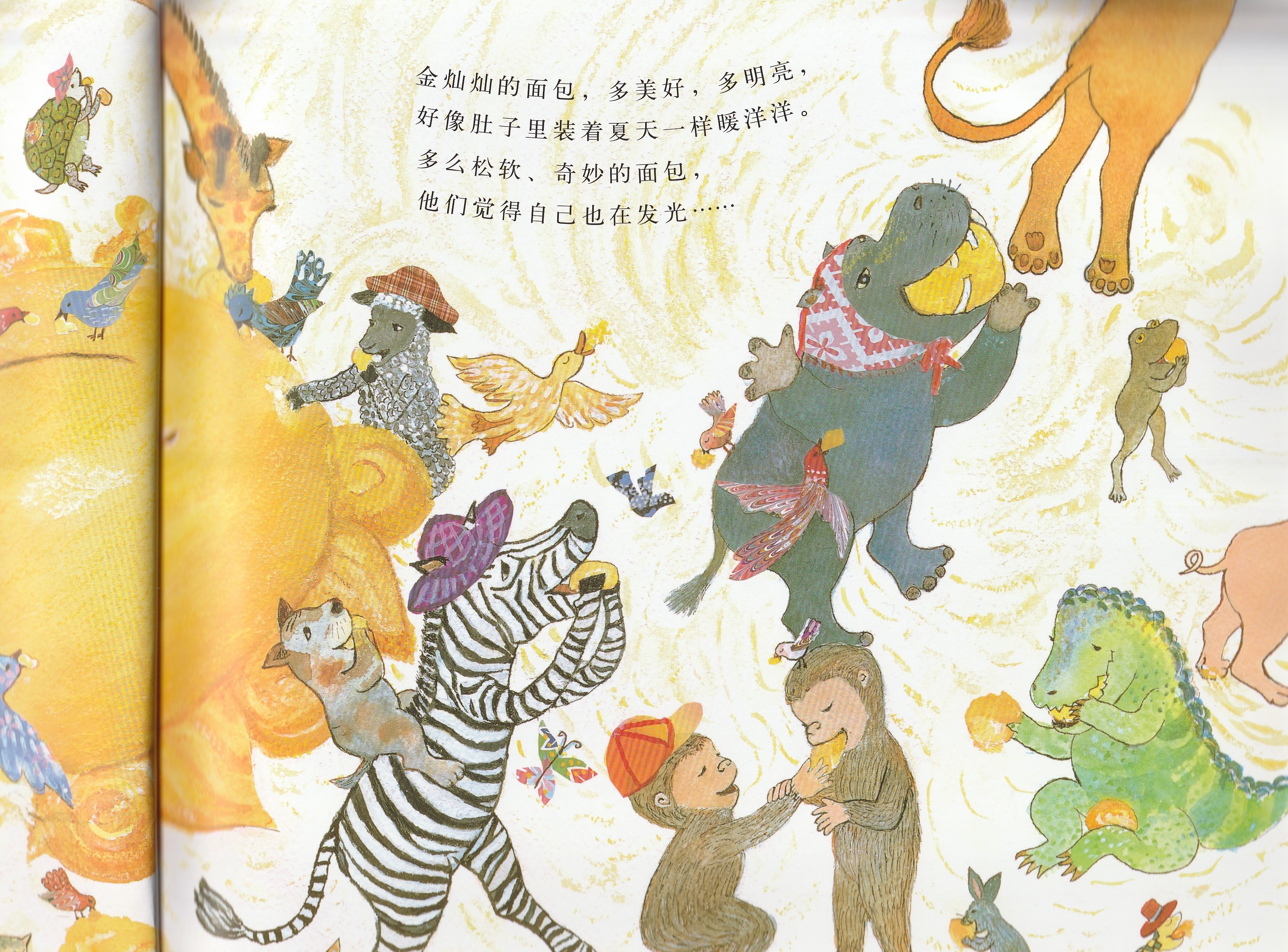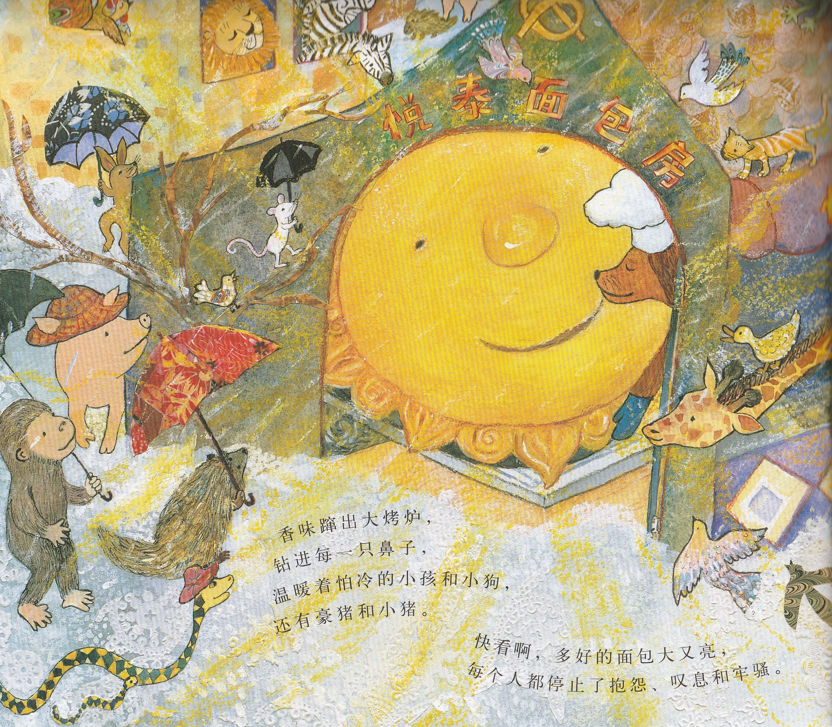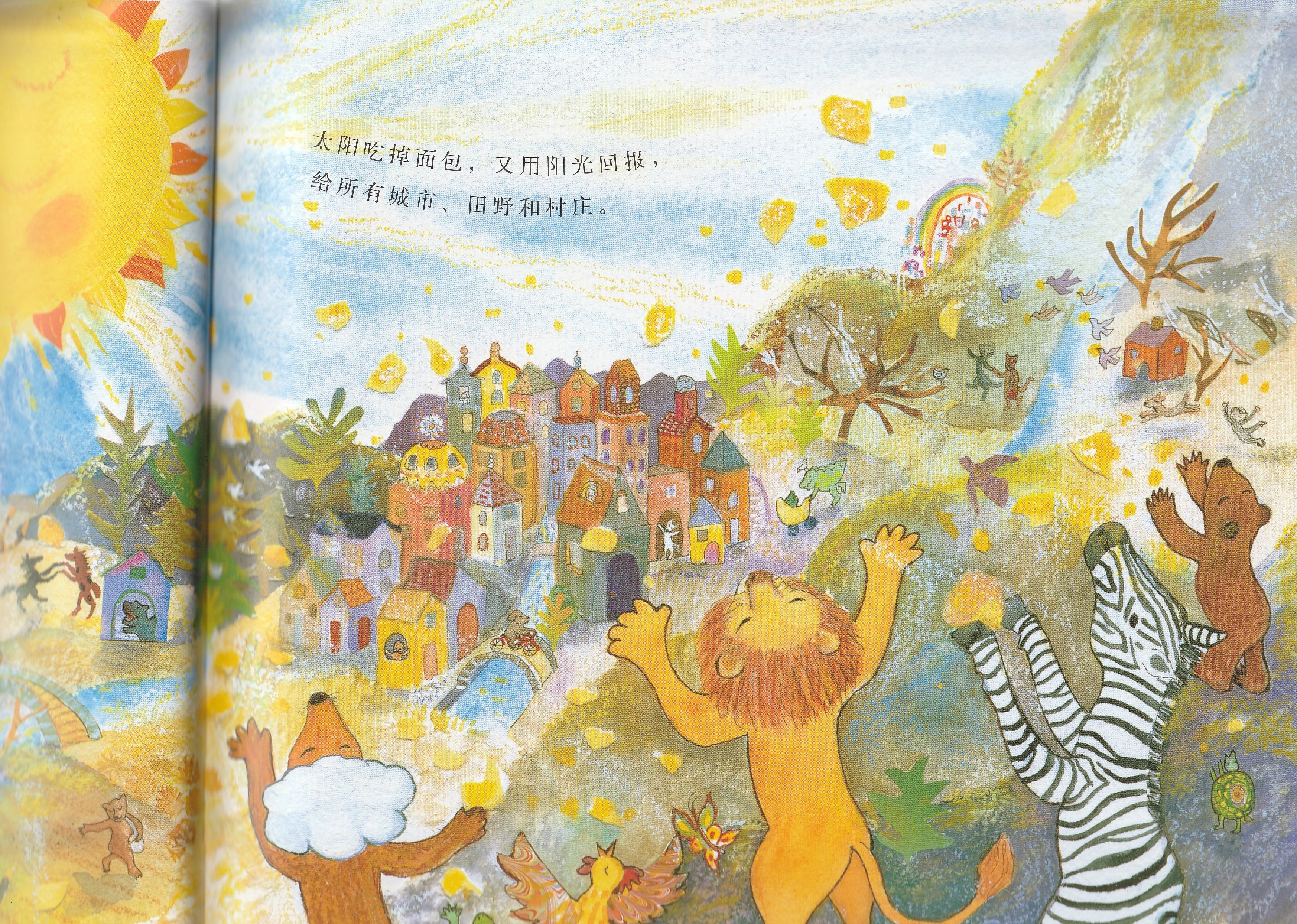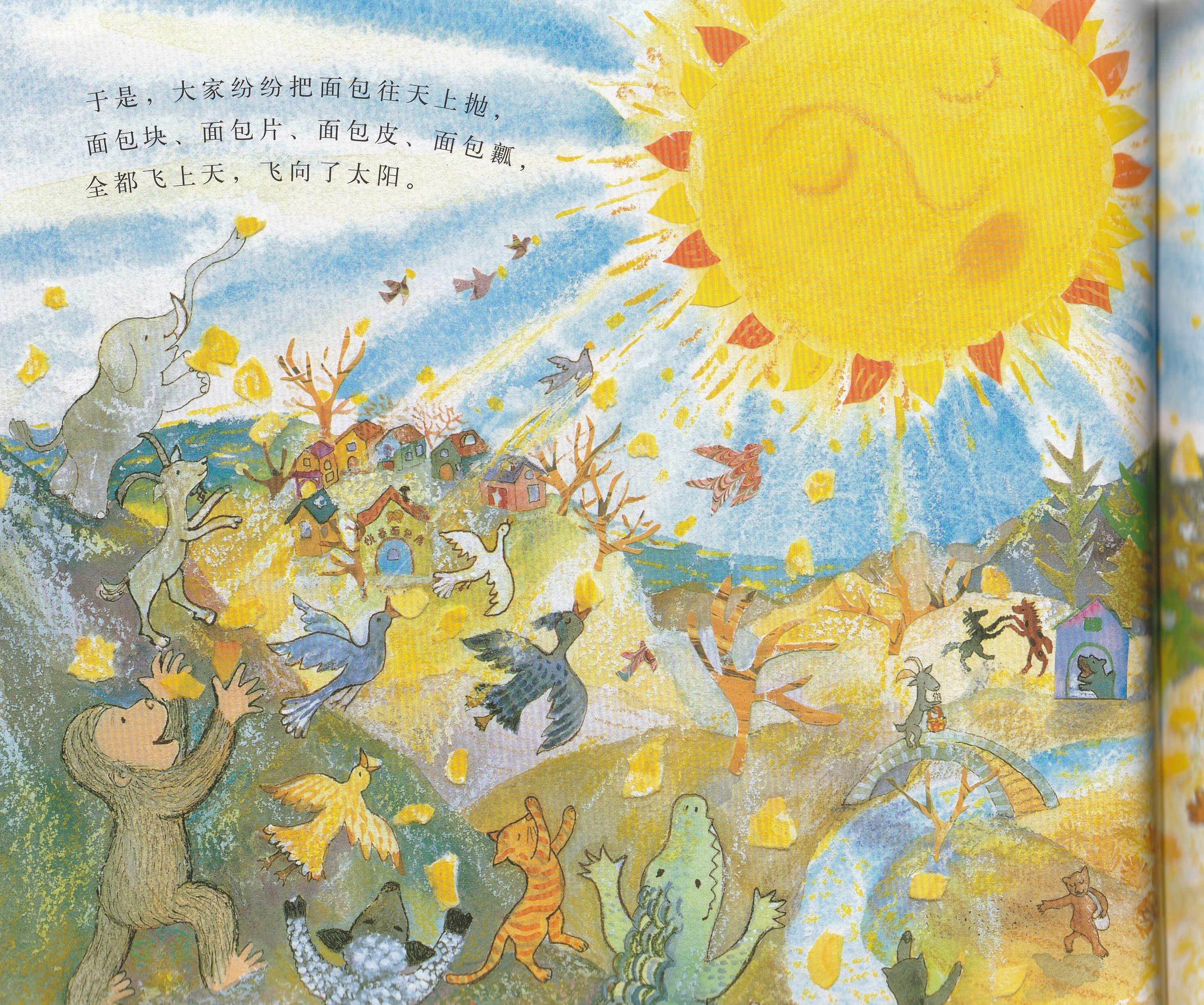 本书是启发精选世界优秀畅销绘本系列之一,适合3岁以上儿童阅读。作者以美妙辉煌的绘图呈现了狗狗面包师召唤太阳的故事,展现了一个梦幻般和谐而美好的自然世界,在潜移默化中告诉孩子,追求梦想的真挚感情可以超越一切隔膜和界限。欢乐盛大的画面中,众多可爱可亲的动物和诸多好看好玩的细节,引诱小朋友的好奇心去观察发现;略带悬疑色彩的故事,会牢牢抓住小朋友的好奇心,促使小朋友跟着面包师一起期待太阳的出现。书后还附有一份烘焙食谱,教你烤制自己的太阳面包!