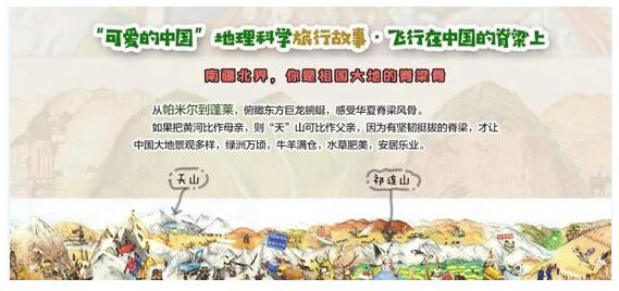 绘本《飞行在中国的脊背上》则非常生动地再现了中国东西向一列伟大的山脉,山连山,从帕米尔高原直到大海。这是一列见证中国从无到有的山峦,从殷商到周城,从长安到洛阳,从兰州到张掖、从敦煌到喀什。