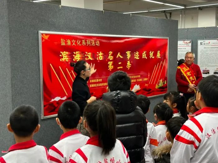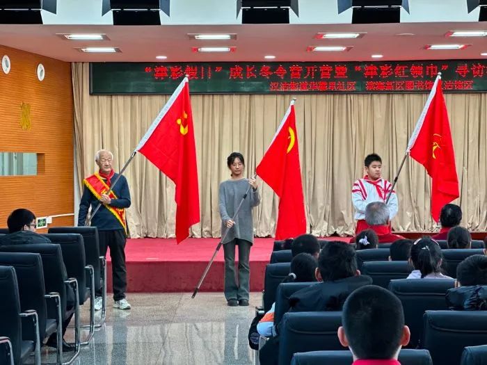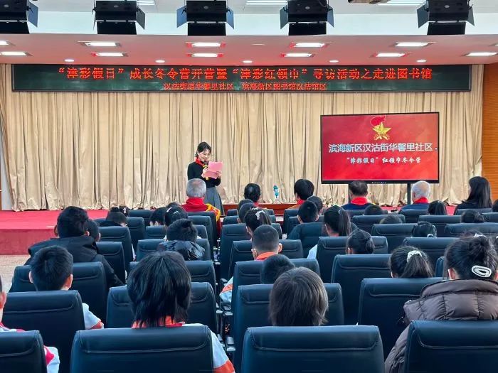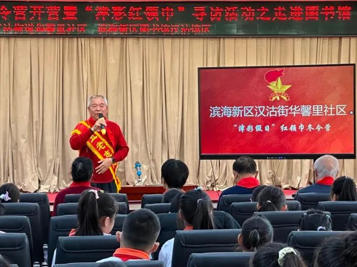在开营队课活动中,滨海新区关工委“五老”宣讲团张励军为社区青少年宣讲了《毛泽东的故事》。接下来是开营活动——“津彩红领巾”寻访活动之走进图书馆,孩子们在图书馆里进行了三个“寻访”:在“寻访魅力家乡 听名人故事 立强国志向”环节中,孩子们参观了位于图书馆三楼展厅的《滨海汉沽名人事迹成就展》,寻访家乡名人的足迹;在“寻访服务体验 传递志愿精神”环节中,由图书管理员引领小读者们在实践中检索名书名著、查验工具书、体验智能化借还书机,同时开展志愿服务,鼓励孩子们成为爱书护书的小使者;在最后一个环节“寻访满城书香 分享读书故事”中,孩子们安静阅读,热情分享,共同寻访书香文化,营造阅读氛围。